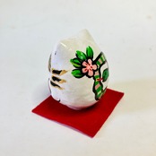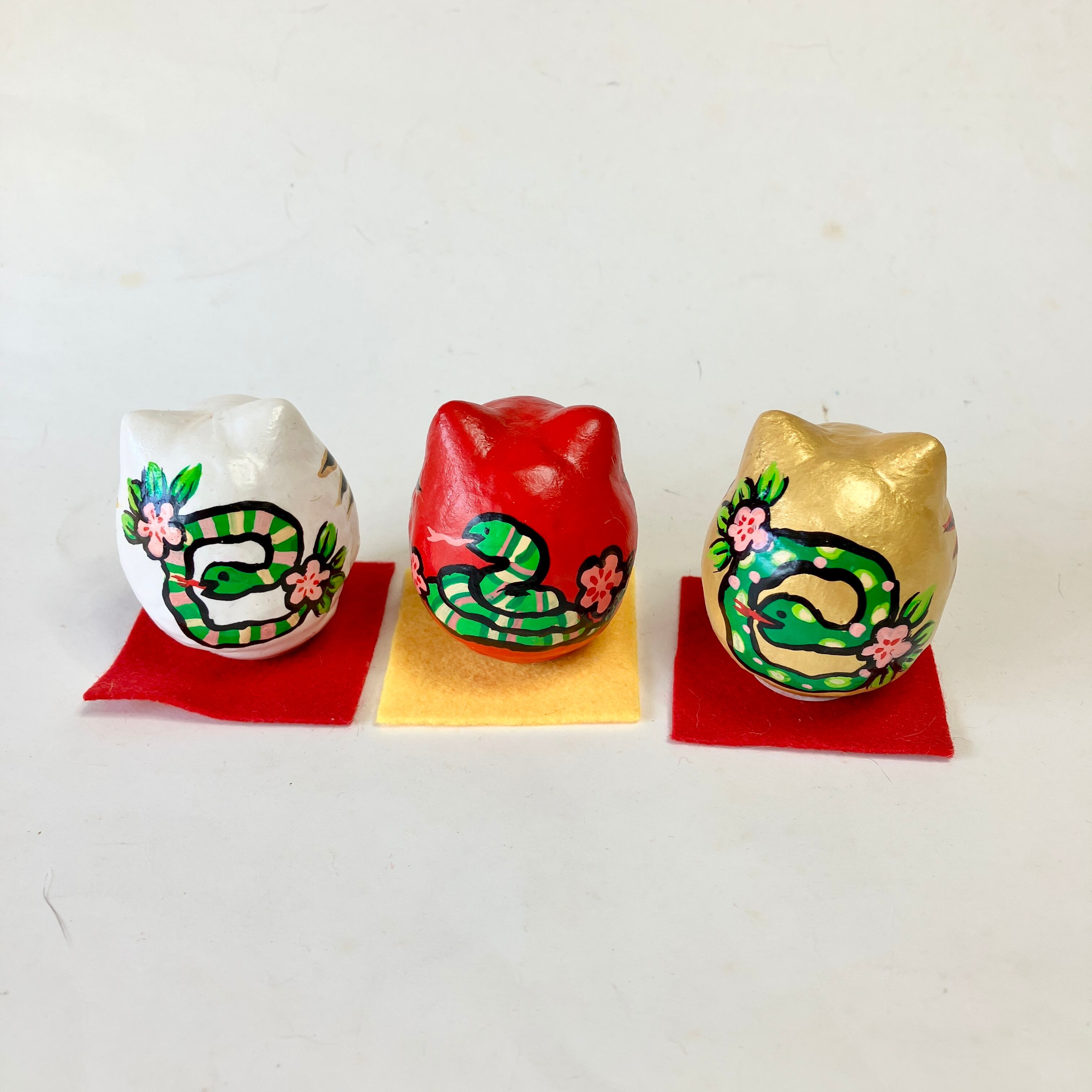 巳猫だるまは、手のひらサイズのコロンとした可愛らしいフォルムで、前面にはハートを持った招き猫、背面には巳年の象徴である蛇のモチーフが描かれている全て手作りの一点もの。